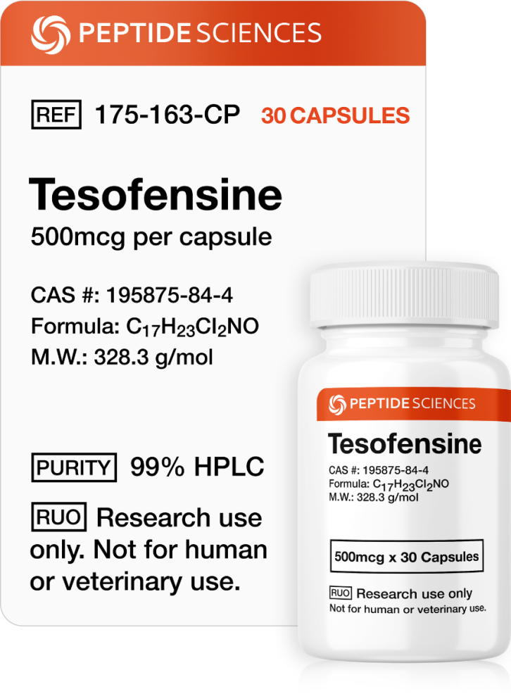 Tesofensine is a synthetic small-molecule research compound classified as a triple monoamine reuptake inhibitor of serotonin, norepinephrine, and dopamine. It modulates central appetite and metabolic signaling through presynaptic transporter inhibition and hypothalamic regulation in experimental models. Tesofensine is used in neuroendocrine and metabolic research investigating neurotransmitter dynamics, energy expenditure, and hypothalamic control mechanisms.